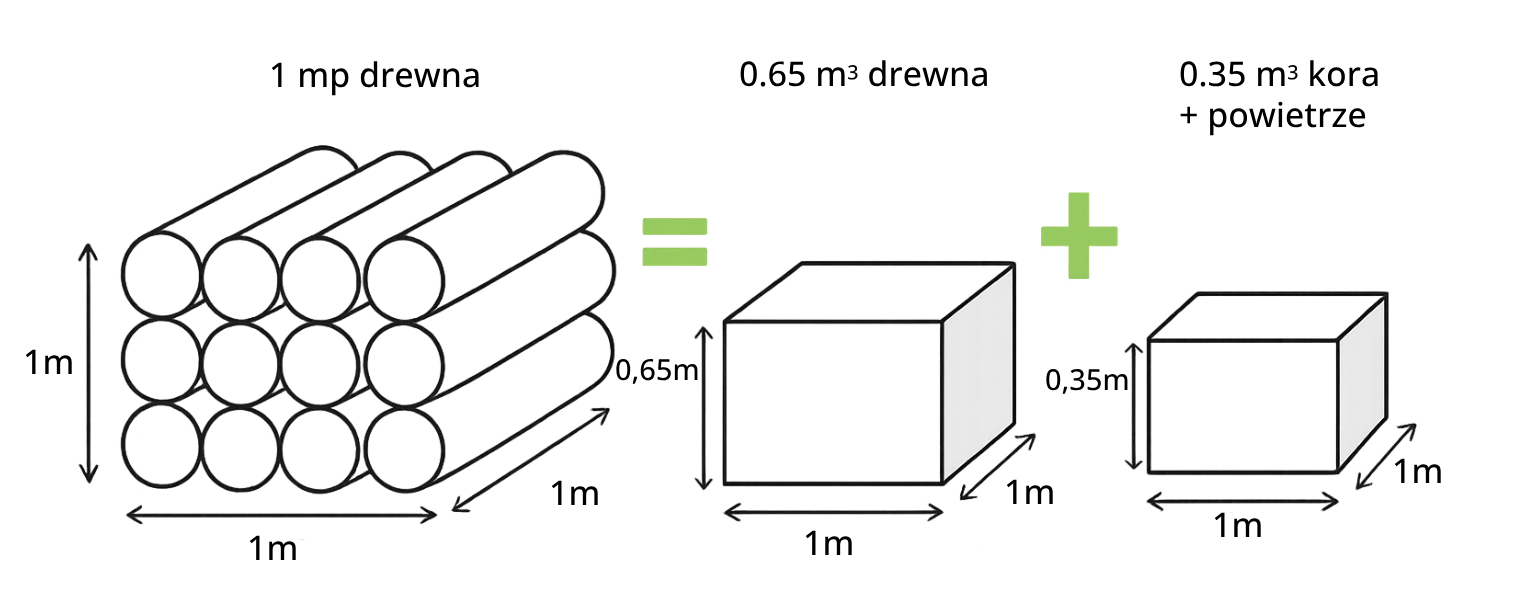 • Metr sześcienny (m3): tzw. kubik to objętość odpowiadająca sześcianowi drewna, bez pustych przestrzeni pomiędzy kawałkami drewna o wymiarach 1m x 1m x 1m. 1 m³ = 1,54mp. • Metr przestrzenny (mp): miara objętości używana w handlu drewnem opałowym i kominkowym. To najczęściej stosowana miara po ułożeniu drewna pociętego i połupanego która mieści się w przestrzeni 1m³ uwzględniająca puste przestrzenie oraz nierówne kształty drewna.1 mp = 0,65m³ • Metr przestrzenny układany (mpu): najbardziej wiarygodny i użyteczny wskaźnik pomiaru objętości ilości drewna równomiernie pociętego, połupanego i ułożonego bardzo dokładnie np. na palecie 0,80m x 1,20m x 1,00m lub w skrzyni o wymiarach 1m x 1m x 1m.1 mpu = 0,47 m³ • Metr przestrzenny nasypowy (mpn): najmniej dokładny wskaźnik pomiaru ilości drewna spowodowany różnorodnością wolnych przestrzeni znajdujących się pomiędzy szczapkami drewna. Jest to drewno narzucane ręcznie luzem lub za pomocą taśmociągu na skrzynię ładunkową. 1 mpn = 0,68 mp = 0,48 m³